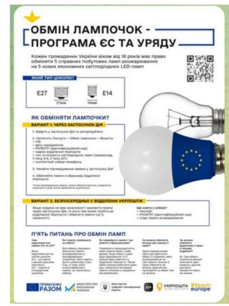 Для обміну чекаємо вас у відділеннях Укрпошти з паспортом, РНОКПП, телефоном для верифікації та 5 справними лампами розжарювання.