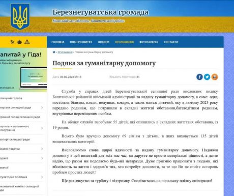 Служба у справах Березнегуватської селищної ради висловлює щиру подяку керівництву районної військової адміністрації за отриману допомогу 69 сім’ями з дітьми, в яких виховується 135 дітей вищевказаних категорій.