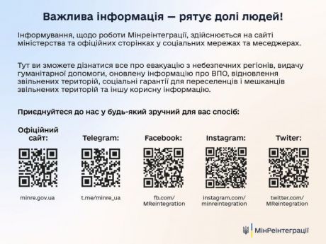 Інформування, щодо роботи Мінреінтеграції, здійснюється на сайті міністрерства та офіційних сторінках у соціальних мережах та меседжерах.