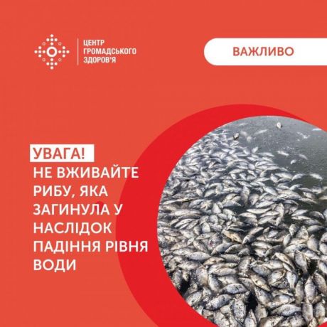 Центр громадського здоров’я України нагадує: мертву рибу або ту, що вмирає, не можна збирати для подальшого зберігання, готувати чи споживати. Жоден спосіб приготування не зробить її безпечною для вас: таку рибу не можна вживати, у т. ч. сушити, в’ялити, смажити чи варити. Ця риба може містити збудники інфекційних хвороб, паразитів чи небезпечні хімічні речовини!