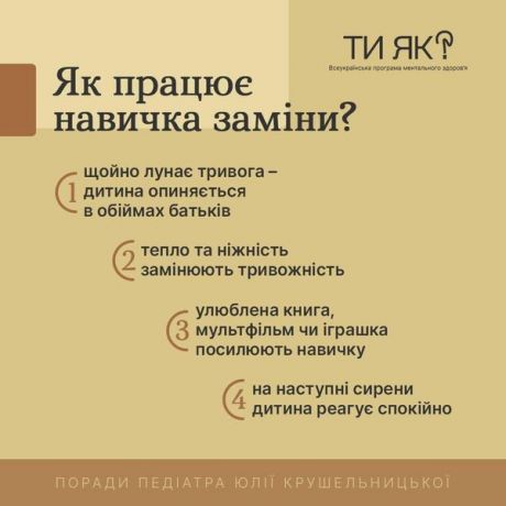За словами лікарки, до неї часто звертаються люди, які евакуювались із зон активних бойових дій, і багато хто з проблемою дитячого страху. Діти бояться шуму, вибухів, сирен, навіть ховаються від них під ліжко. У цьому разі, на думку пані Юлії, допоможе формування навички заміни.