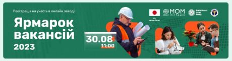 У межах програми “Відбудова та розвиток 2023: працевлаштування та бізнес” ГО "Маріупольська Спілка Молоді" за підтримки Міжнародної організації з міграції та Державної служби зайнятості проводить онлайн захід «Ярмарок Вакансій 2023: Робота Є!» для молодих людей у віці 16-35 років та мешканців Миколаївської області, що відбудеться 30 серпня 2023 року в форматі онлайн з 11:00 до 14:00.