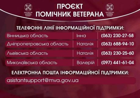 Активно працюють канали інформаційної підтримки процесу набору помічників ветеранів. На ваші запитання очікують телефонні лінії інформаційної підтримки проєкту: