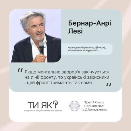 Бернар-Анрі Леві, французький режисер, філософ, письменник та журналіст на третьому Summit of First Ladies and Gentlemen поділився враженнями про зйомки документальних фільмів, присвячених повномасштабному вторгненню Росії в Україну