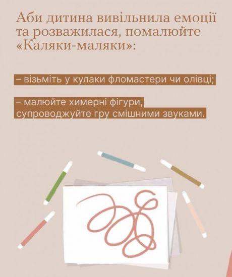 Навіть у складні часи пам’ятайте про прості та веселі ігри — вони відволікають, допомагають виплеснути емоції та якийсь час безтурботно порадіти. Вимкніть серйозність та запропонуйте дитині помалювати «Каляки-маляки»