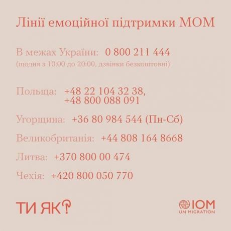 Лінія емоційної підтримки Міжнародної організації з міграції (МОМ) — це безкоштовна та анонімна допомога кваліфікованих психологів, які готові вислухати вас при будь-яких запитах для покращення емоційного стану.