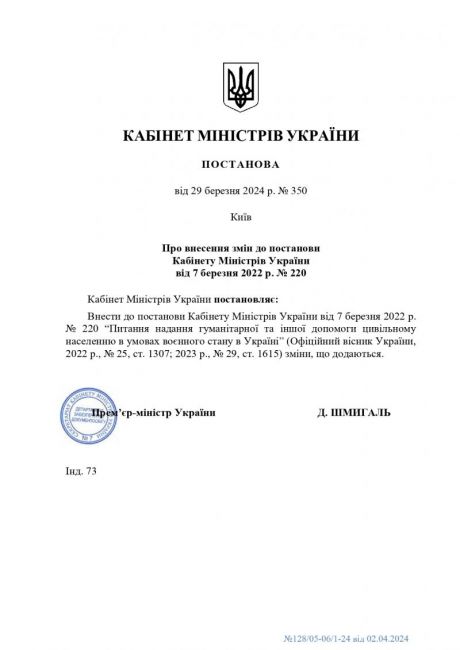 Кабінетом Міністрів України прийнято постанову від 29 березня 2024 року № 350 "Про внесення змін до постанови Кабінету Міністрів України від 7 березня 2022р. № 220"