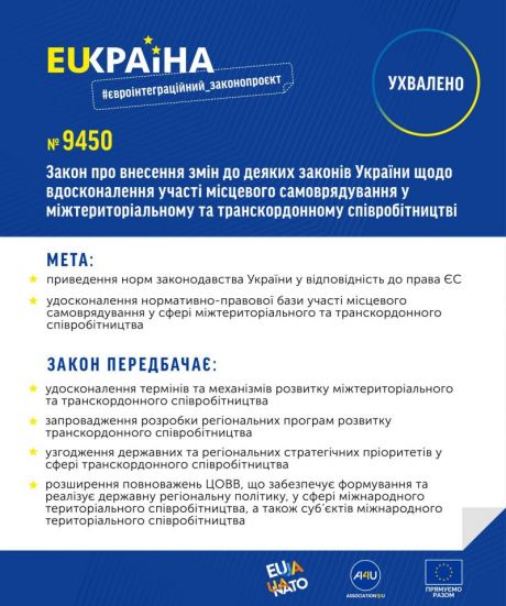 у другому читанні - № 9450 про зміни до деяких законів України щодо вдосконалення участі місцевого самоврядування у міжтериторіальному та транскордонному співробітництві