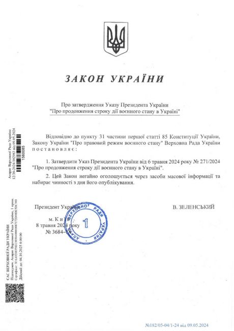 Підприсано Закон, прийнятий Верховною Радою України 8 травня 2024 року № 3684-IX "Про затвердження Указу Президента "Про продовження строку дії воєнного стану в Україні", який набирає чинності з дня його опублікування.