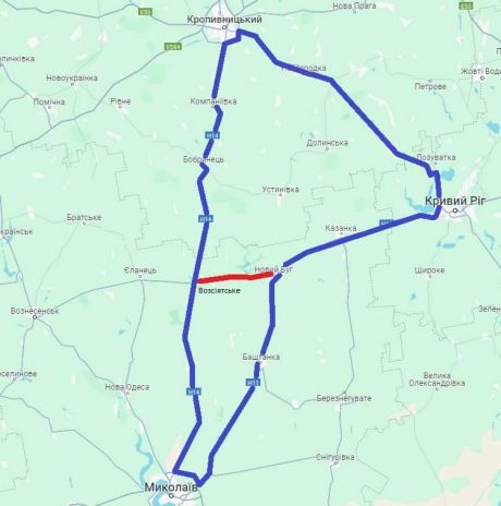 Об'їзд ділянки ремонту транзитного транспорту передбачається через м. Кропивницький, м. Кривий Ріг та м. Миколаїв (схема додається).