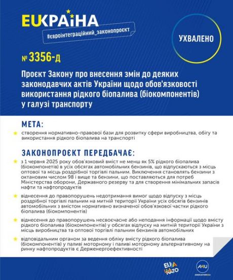 Верховна Рада України ухвалила в цілому законопроєкт № 3356-Д щодо обов'язковості використання рідкого біопалива (біокомпонентів) у галузі транспорту.