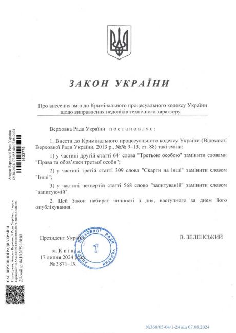 Підписано Закон, прийнятий Верховною Радою України 17 липня 2024 року № 3871-IX "Про внесення змін до Кримінального процесуального кодексу України щодо виправлення недоліків технічного характеру", який набирає чинності з дня, наступного за днем його опублікування.