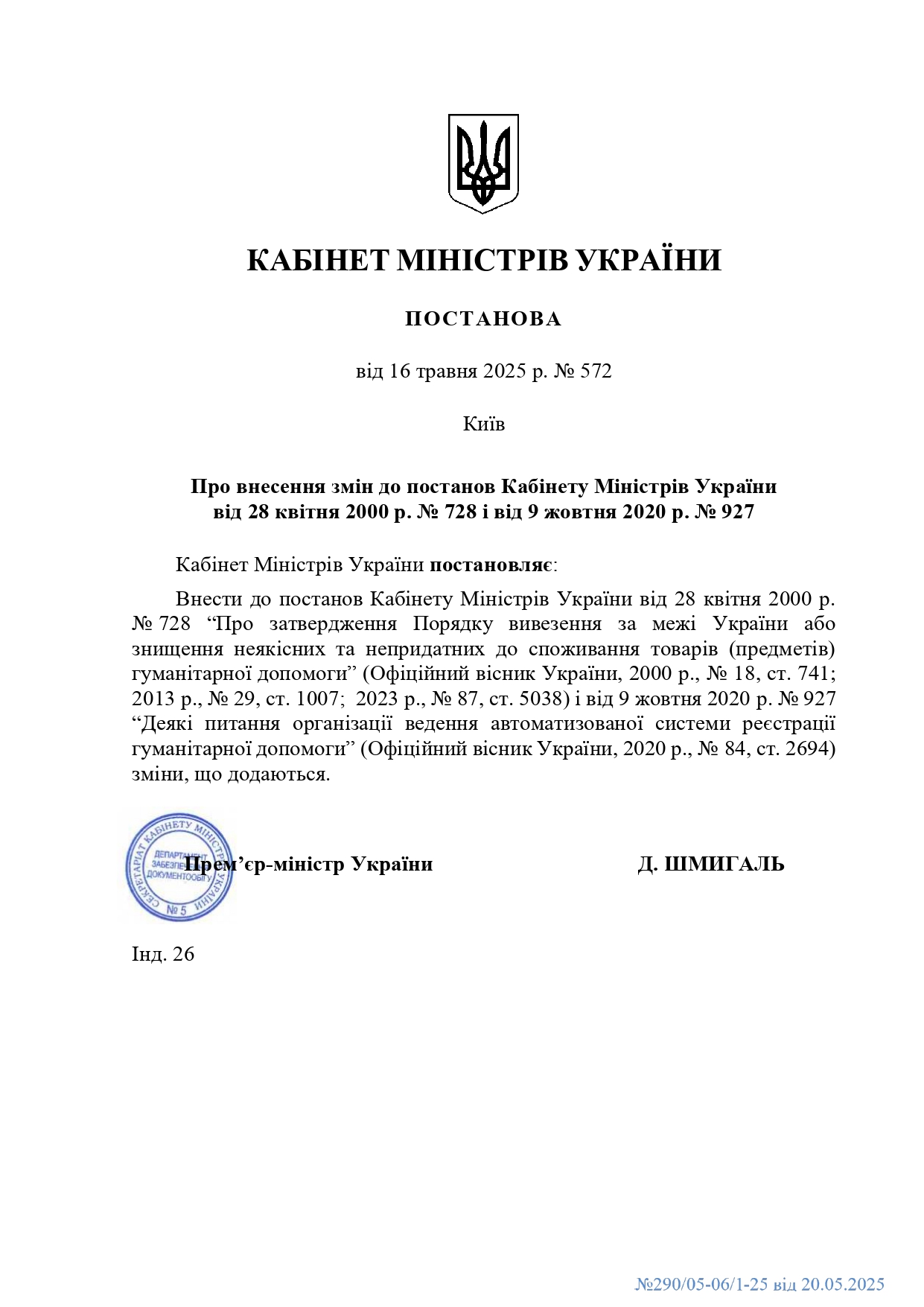 Кабінетом Міністрів України затверджено постанову від 16 травня 2025 року № 572 "Про внесення змін до постанов Кабінету Міністрів України від 28 квітня 2000 р. No 728 і від 9 жовтня 2020 р. No 927".