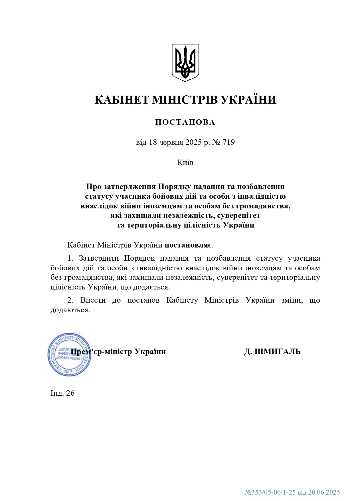 Кабінетом Міністрів України затверджено постанову від 18 червня 2025 року № 719 "Про затвердження Порядку надання та позбавлення статусу учасника бойових дій та особи з інвалідністю внаслідок війни іноземцям та особам без громадянства, які захищали незалежність, суверенітет та територіальну цілісність України”.