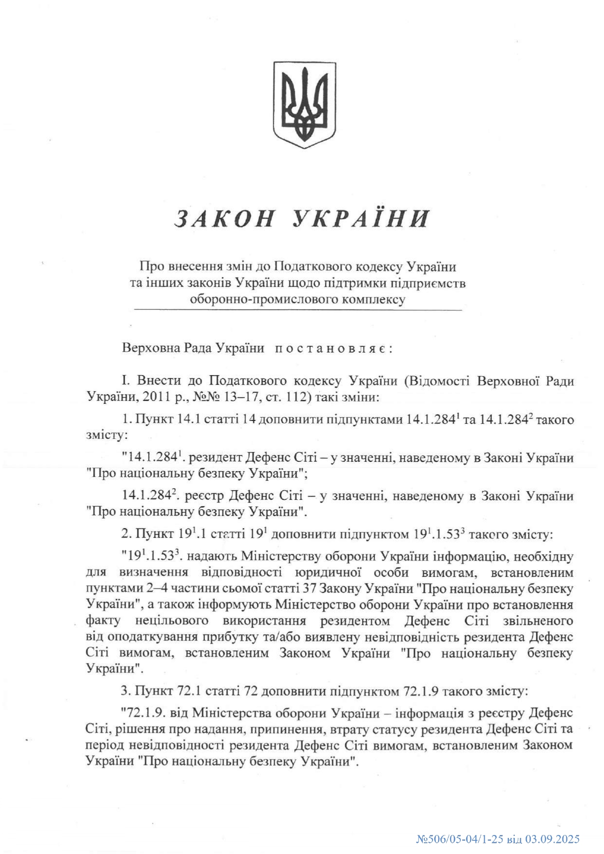 Підписано Закон, прийнятий Верховною Радою України від 21 серпня 2025 року № 4577-IX "Про внесення змін до Податкового кодексу України щодо підтримки підприємств оборонно-промисловго комплексу".