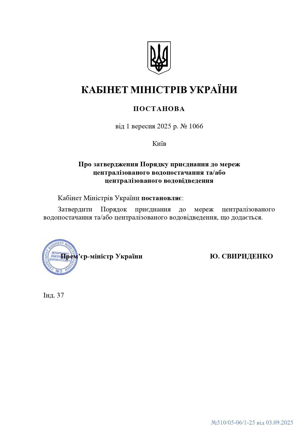 Кабінетом Міністрів України затверджено постанову від 1 вересня 2025 року № 1066 "Про затвердження Порядку приєднання до мереж централізованого водопостачання та/або централізованого водовідведення”.