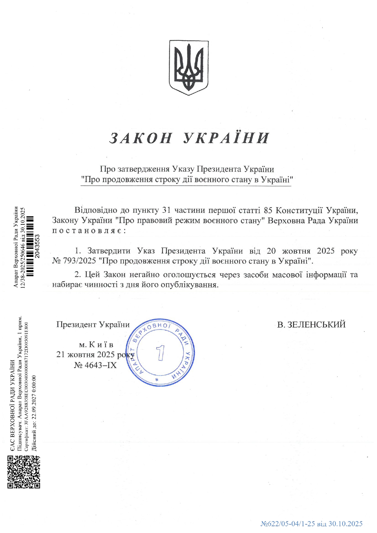 Підписано Закон, прийнятий Верховною Радою України від 21 жовтня 2025 року № 4643-IX "Про затвердження Указу Президента України "Про продовження строку дії воєнного стану в Україні".