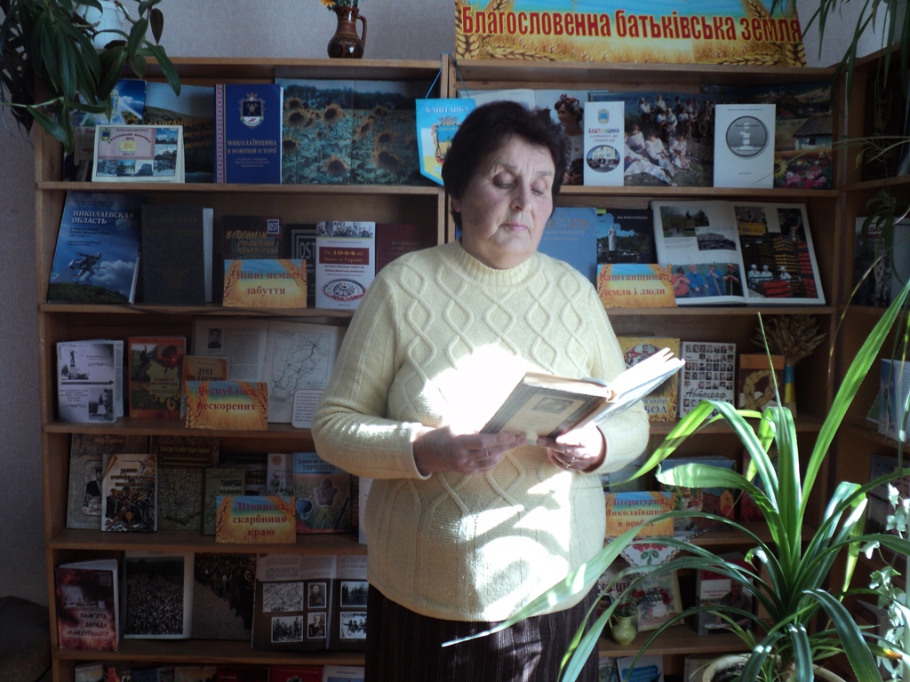Урочисто та піднесено прозвучали поетичні рядки про війну з вуст ветерана Великої Вітчизняної війни П.П.Борисова. Хвилюючі поезії «Розмова з юнаком» та «Могила Невідомого солдата» прочитала активна користувачка бібліотеки М.І.Василенко. Вірші, присвячені воєнній тематиці, які надруковані у новому виданні «Молитва грішника», прозвучали у виконанні баштанського поета С.Г.Боголюка. А подружжя Шведових прочитали найкращі свої поезії про подвиг наших воїнів – визволителів в роки Великої Вітчизняної війни.