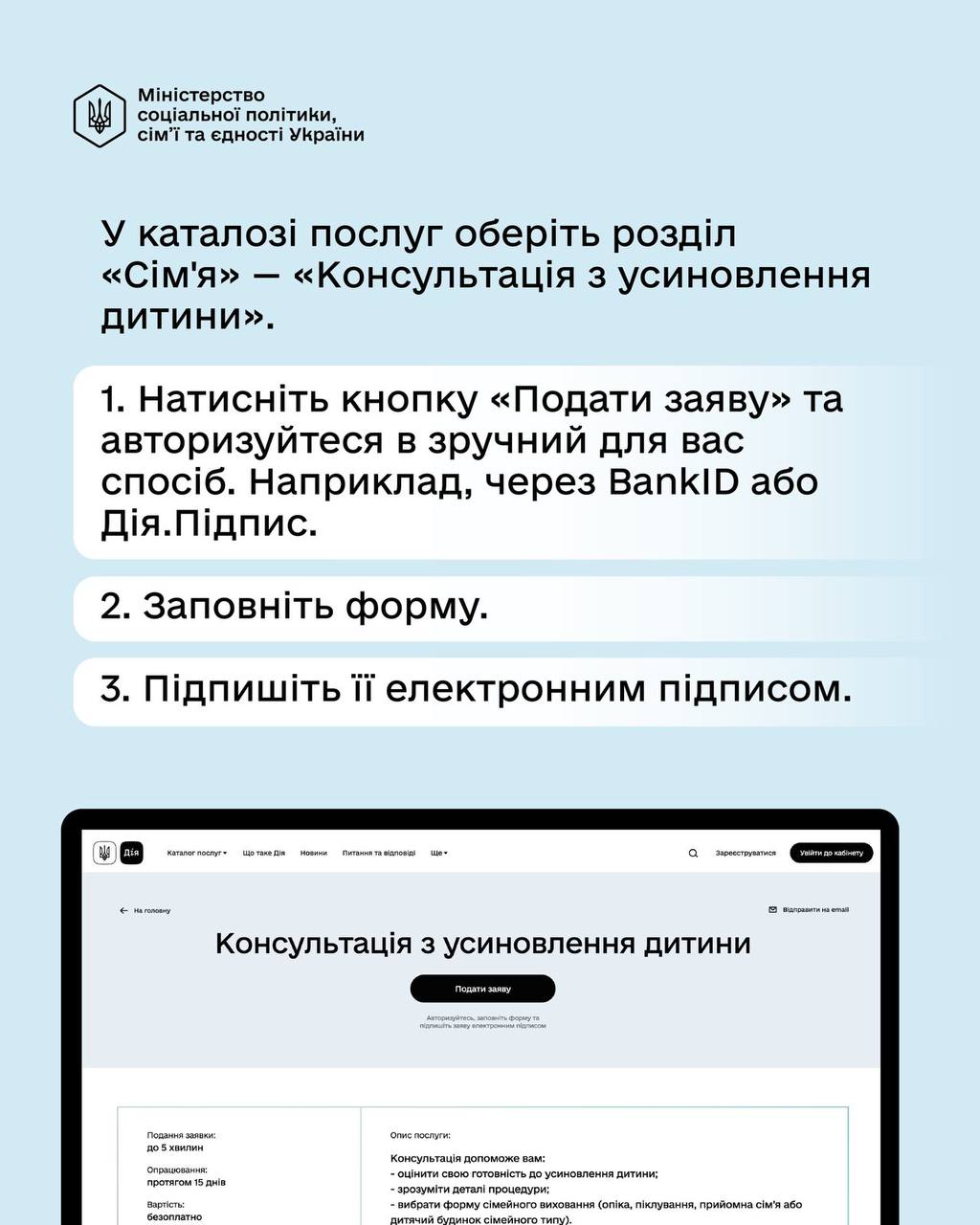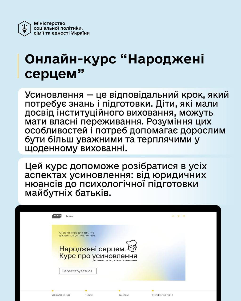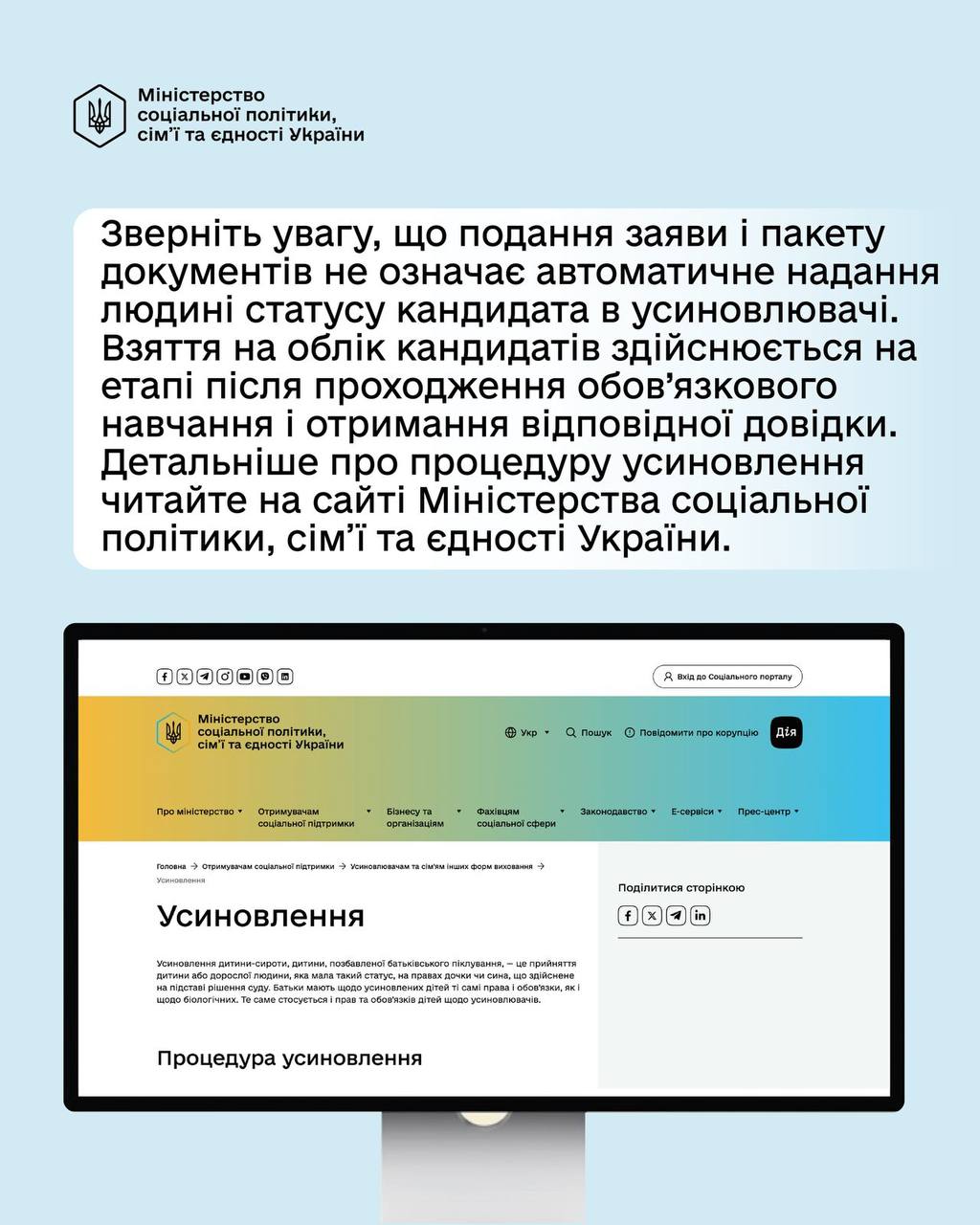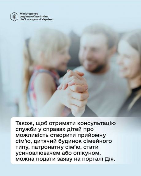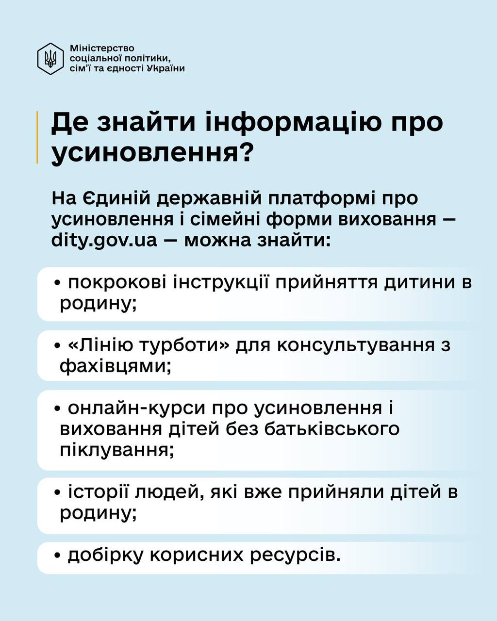 Додаткову інформацію щодо усиновлення можна знайти на картках, підготовлених Міністерством соціальної політики, сім'ї та єдності України.