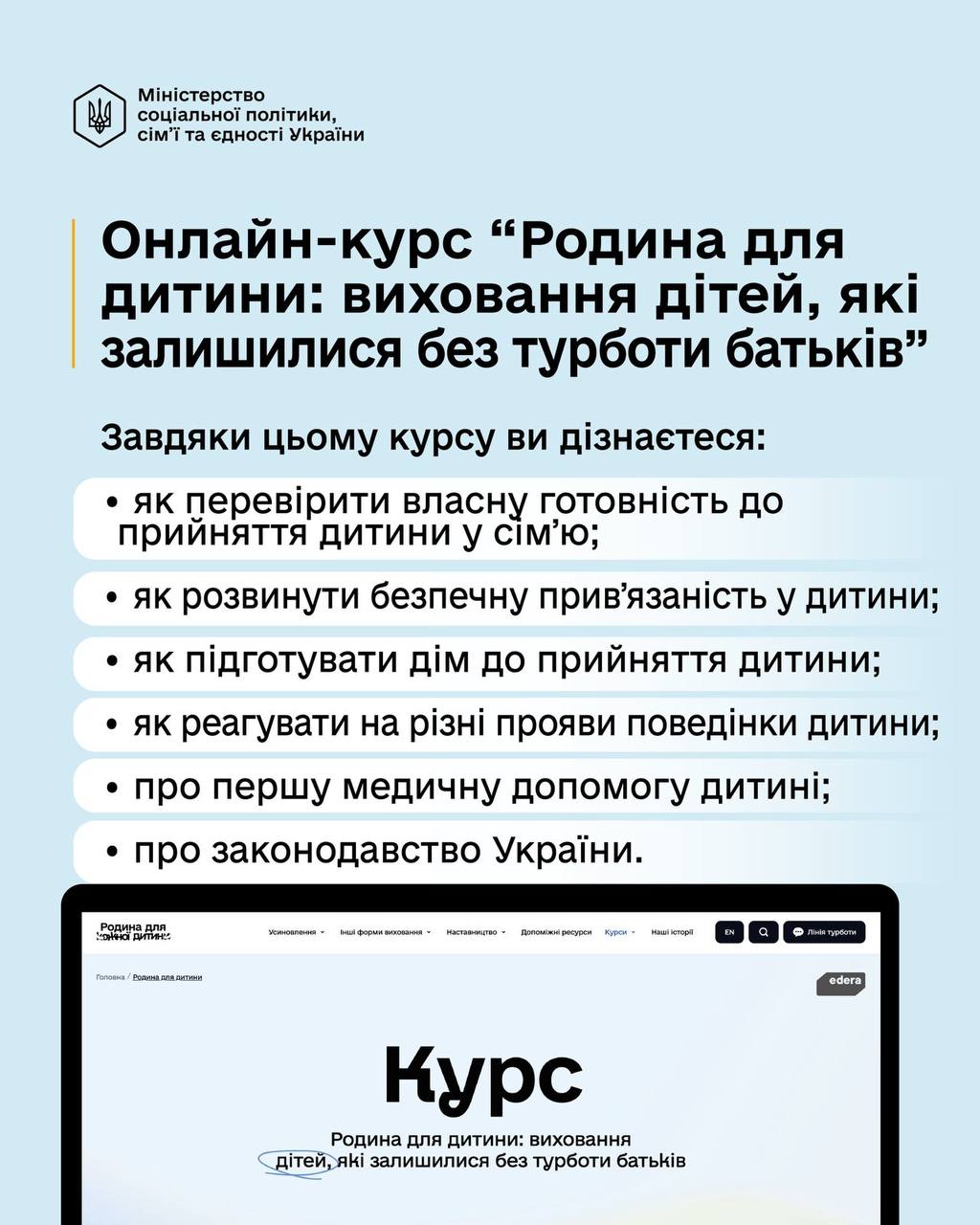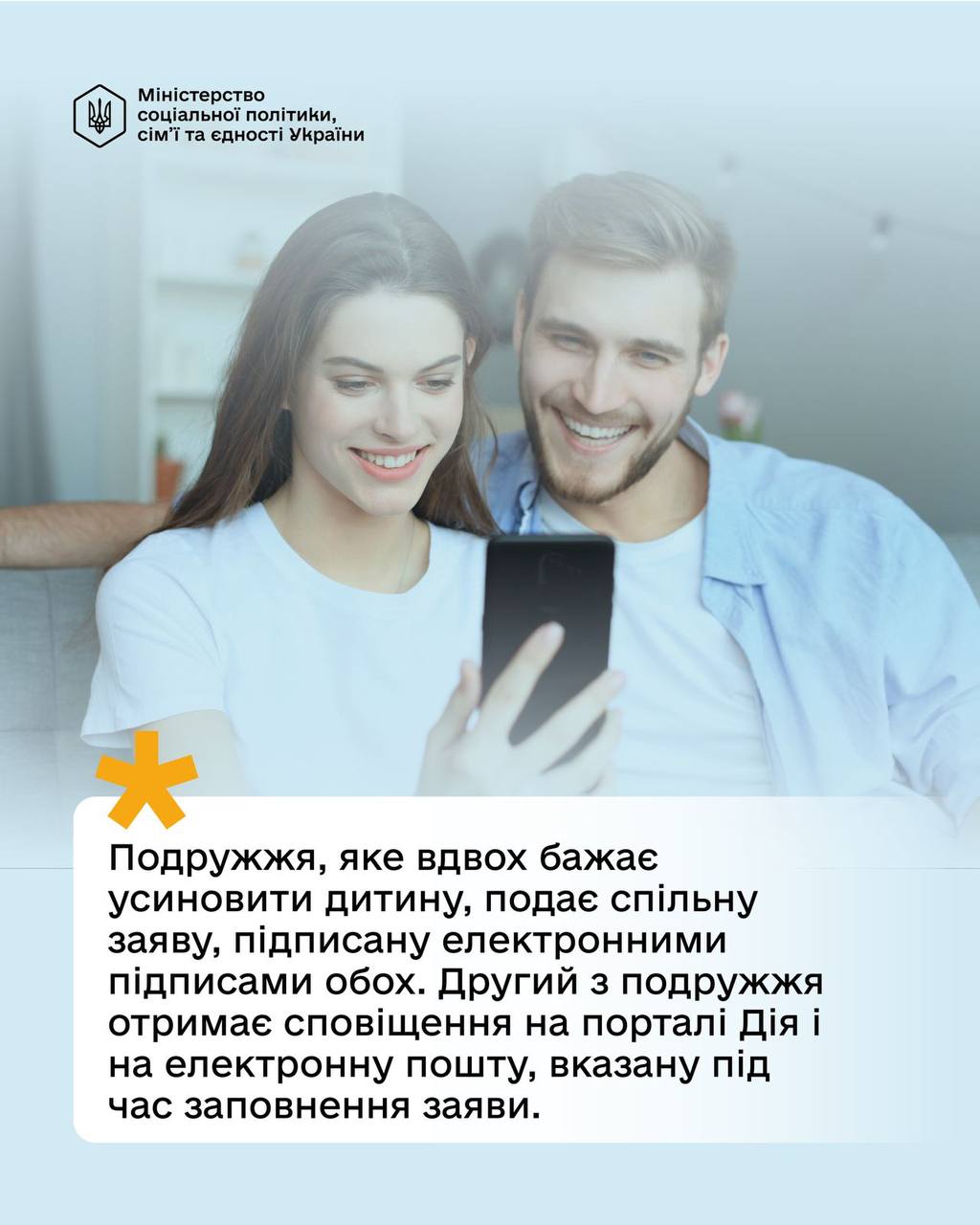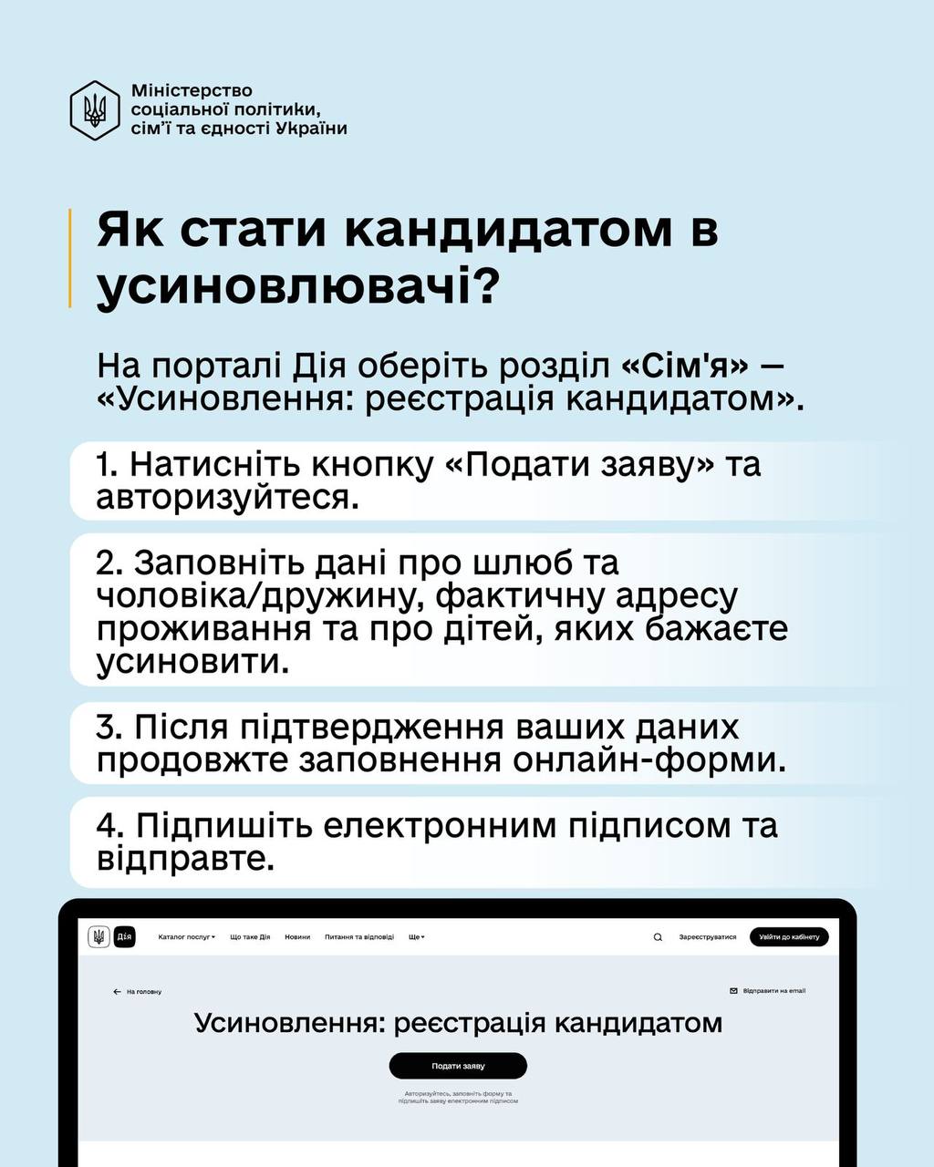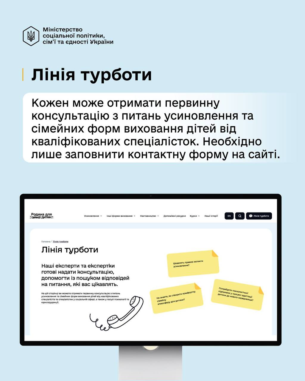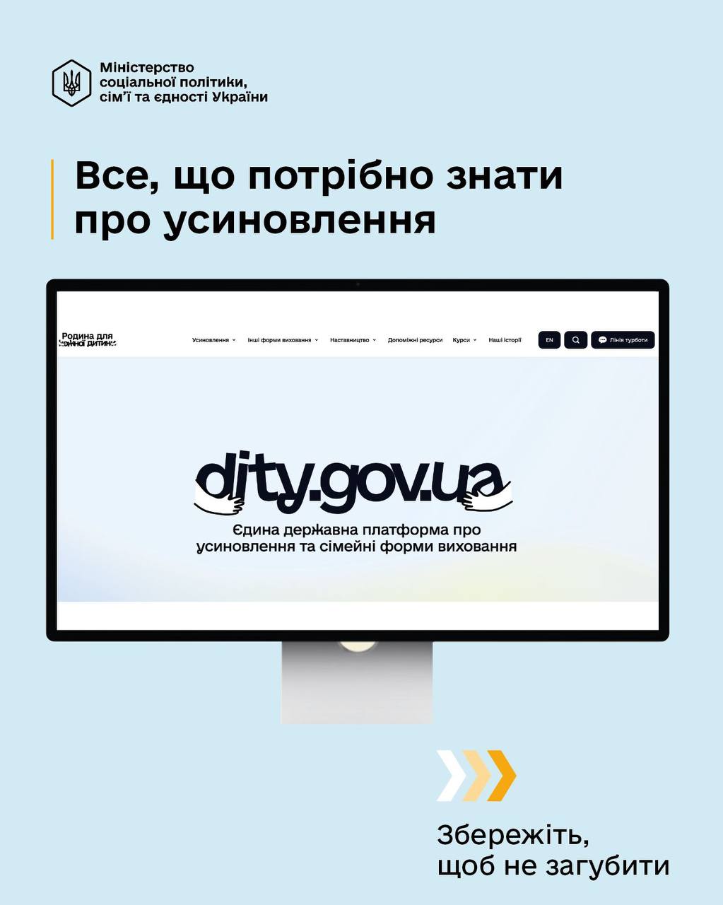 Додаткову інформацію щодо усиновлення можна знайти на картках, підготовлених Міністерством соціальної політики, сім'ї та єдності України.