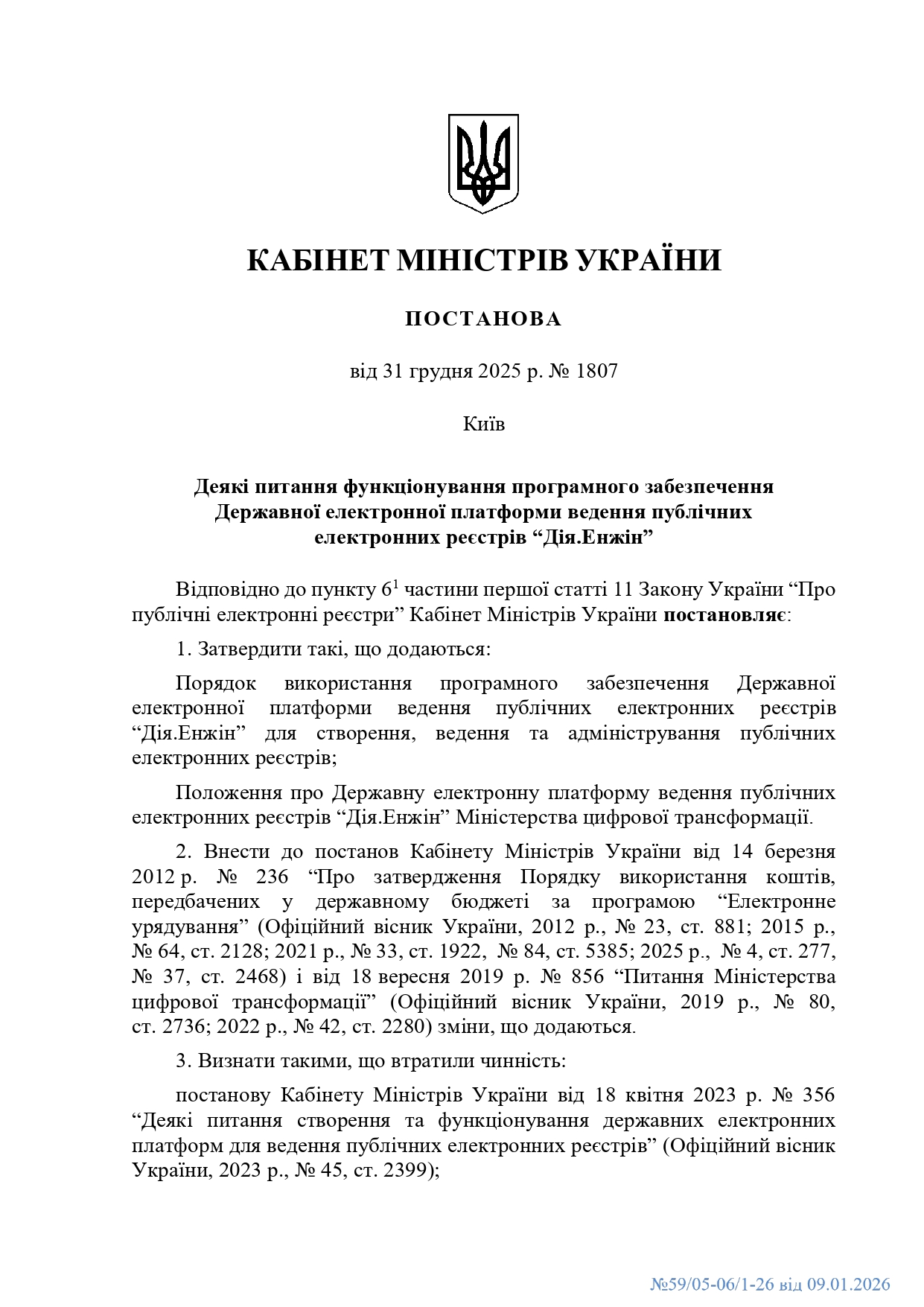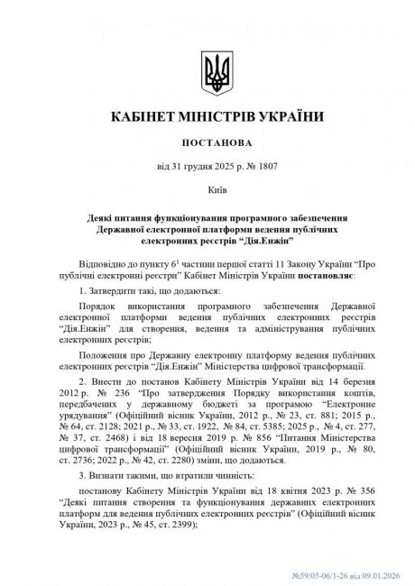Кабінетом Міністрів України затверджено постанову від 31 грудня 2025 року № 1807 "Деякі питання функціонування програмного забезпечення Державної електронної платформи ведення публічних електронних реєстрів “Дія.Енжін”.