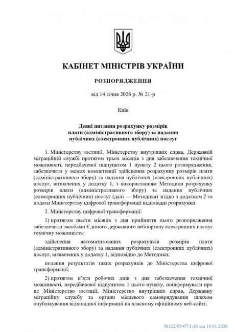 Кабінетом Міністрів України затверджено розпорядження від 14 січня 2026 року № 21-р "Деякі питання розрахунку розмірів плати (адміністративного збору) за надання публічних (електронних публічних) послуг”.