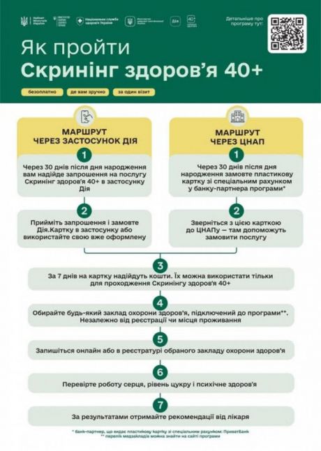 Про перелік обстежень у межах програми «Скринінг здоров’я 40+» та її відмінності від огляду у сімейного лікаря читайте на сайті: https://short-link.phc.org.ua/wt