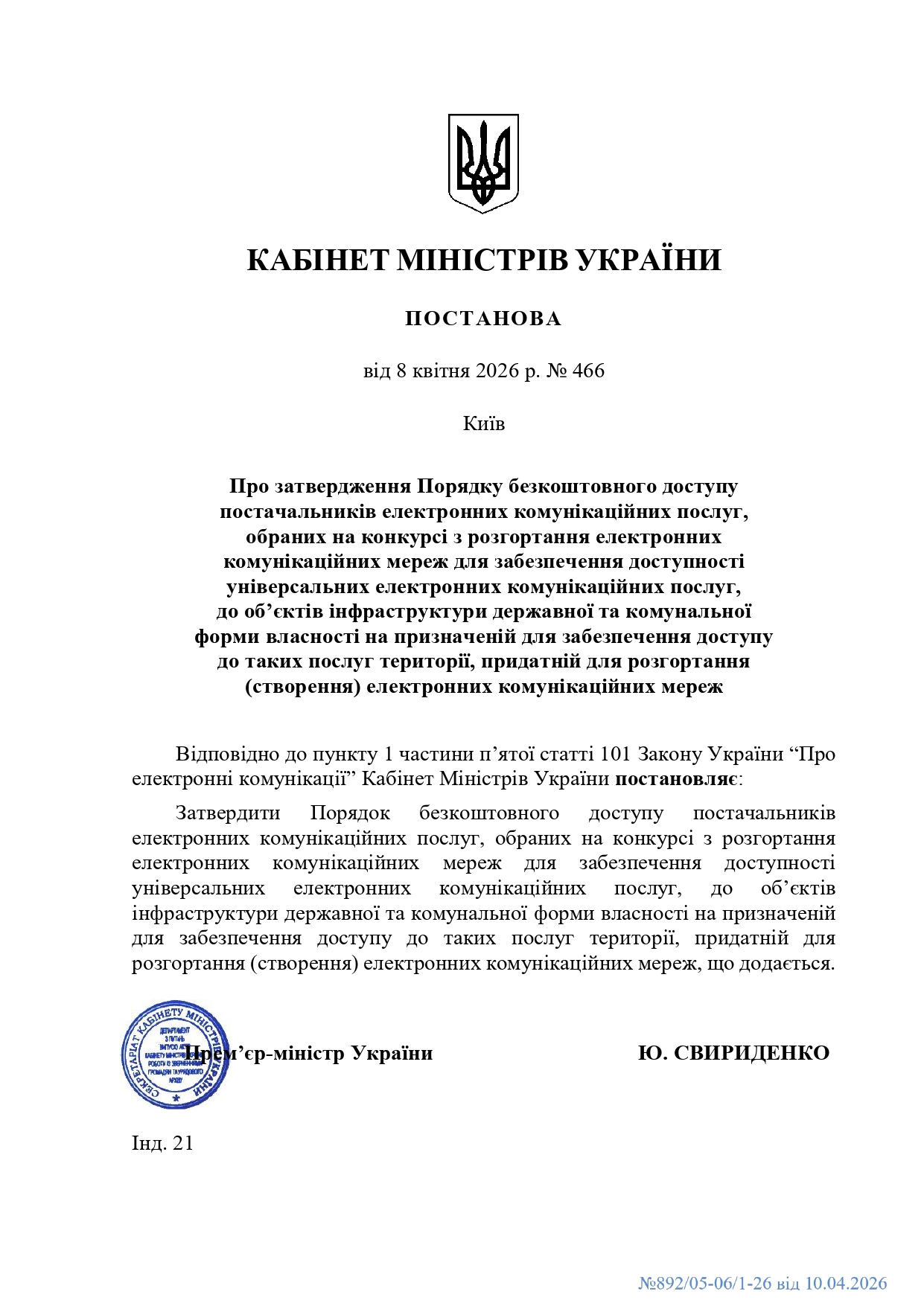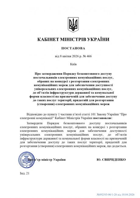 Кабінетом Міністрів України затверджено постанову від 8 квітня 2026 року № 466 "Про затвердження Порядку безкоштовного доступу постачальників електронних комунікаційних послуг, обраних на конкурсі з розгортання електронних комунікаційних мереж для забезпечення доступності універсальних електронних комунікаційних послуг, до об’єктів інфраструктури державної та комунальної форми власності на призначеній для забезпечення доступу до таких послуг території, придатній для розгортання (створення) електронних комунікаційних мереж”.
