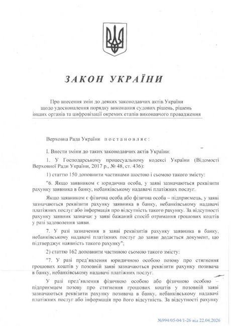 Підписано Закон, прийнятий Верховною Радою України 7 квітня 2026 року № 4833-IX "Про внесення змін до деяких законодавчих актів України щодо удосконалення порядку виконання судових рішень, рішень інших органів та цифровізації окремих етапів виконавчого провадження".