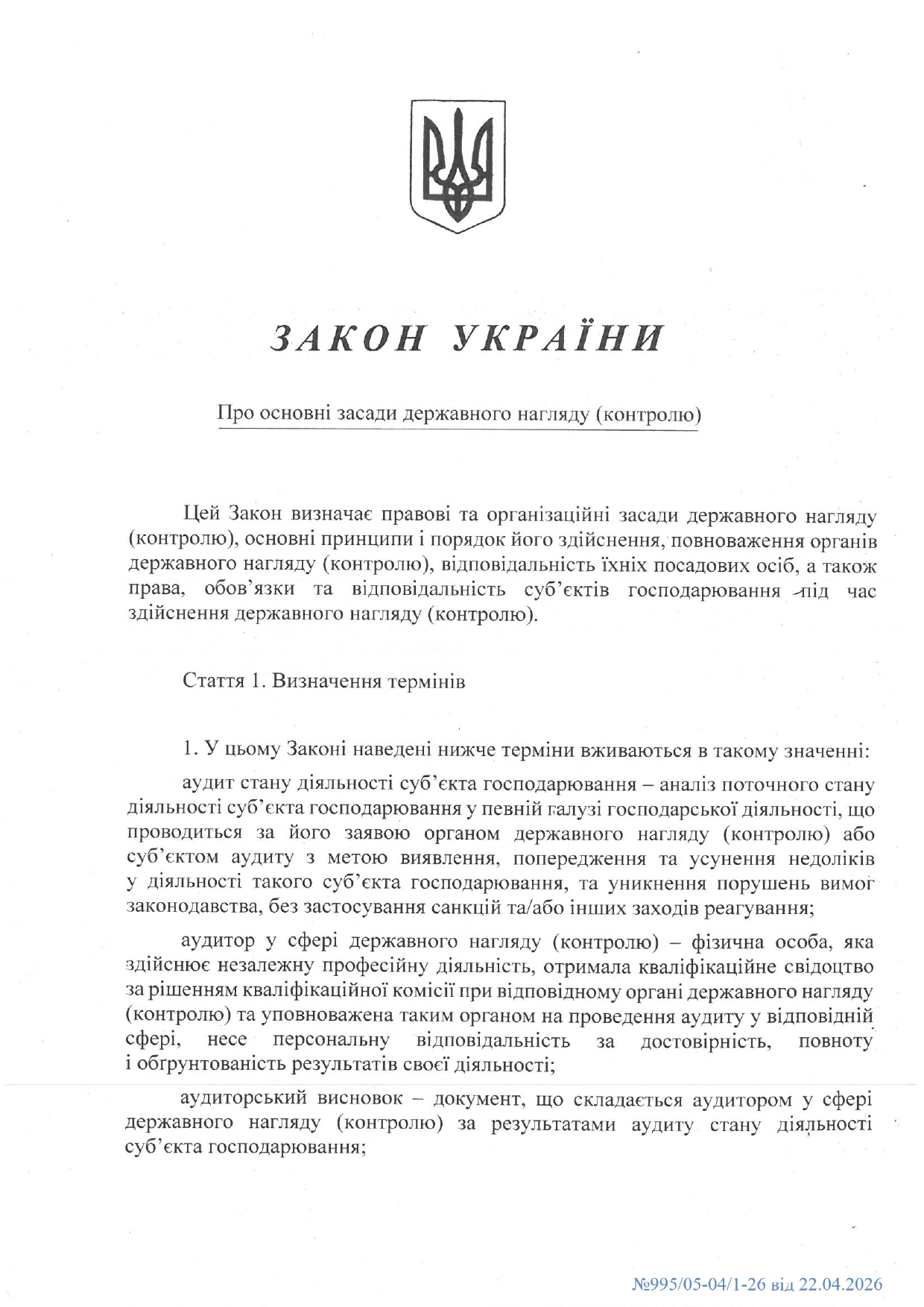 Підписано Закон, прийнятий Верховною Радою України 8 квітня 2026 року № 4840-IX "Про основні заходи державного нагляду (контролю)".