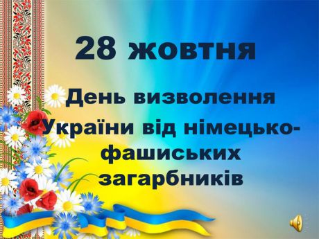 28 жовтня – День визволення України від фашистських загарбників... Це свято встановлено в Україні згідно з Указом Президента від 20 жовтня 2009 року № 836/2009 «з метою всенародного відзначення визволення України від фашистських загарбників, вшанування героїчного подвигу і жертовності українського народу у Другій світовій війні».
