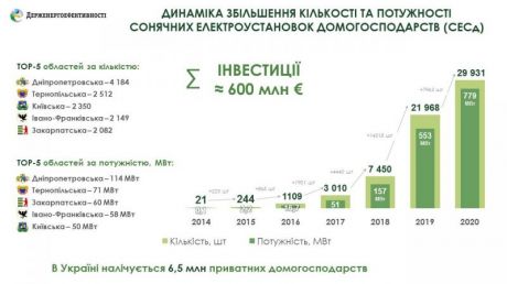Станом на кінець 2020 року в Україні налічується більше 29900 сімей, які встановили сонячні панелі. Їхня загальна потужність сягає 780 МВт.