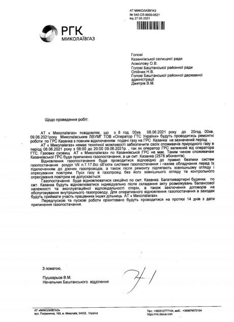 Доводимо до вашого відомаінформацію, яка надійшла на адресу райдержадміністрації від АТ "Миколаївгаз". Голові Баштанської райдержадміністрації Владиславу Дмитріву. АТ "Миколаївгаз" повідомляє, що з 8:00 08.06.2021 до 20:00 09.06.2021 Миколаївським ЛВУМГ ТОВ "Оператор ГТС України" будуть проводитись ремонтні роботи по ГРС Казанка з повним відключенням подачі газу на ГРС Казанка на зазначений період. АТ "Миколаївгаз" не має технічної можливості забезпечити своїх споживачів природного газу в період з 08.06.2021 з 08:00 до 20:00 09.06.2021, так як оператор ГРС залежний від оператора ГТС. Газових сховищ АТ "Миколаївгаз" по Казанківській ГРС не має. Таким чином споживачам Казанківської ГРС буде припинено газопостачання, а це смт Казанка (2578 абонентів). Відновлення газопостачання буде проводитися відповідно до правил безпеки систем газопостачання (розділ VII, п.7.17). Всі об'єкти системи газопостачання і газове обладнання перед їх підключенням до діючих газопроводів, а також після ремонту підлягають зовнішньому огляду і опресування повітрям. Пуск газу в газопровід без його зовнішнього огляду та контрольного опресування повітрям не допускається. Газопостачання буде відновлюватися секційно по смт Казанка. Багатоквартирні будинки по смт Казанка будуть відновлюватися індивідуально після складання акту розмежуваннь балансової належності та експлуатаційної відповідальності сторін, а також заключення договорів на обслуговування внутрішнього газопроводу. Для оперативного відновлення газопостачання в заходах прийматимуть участь працівники інших дільниць АТ "Миколаївгаз". Передпускові та пускові роботи орієнтовно будуть проводитись протягом 14 днів з дати припинення газопостачання. З повагою, начальник Баштанського відділення В.Пушкарьов