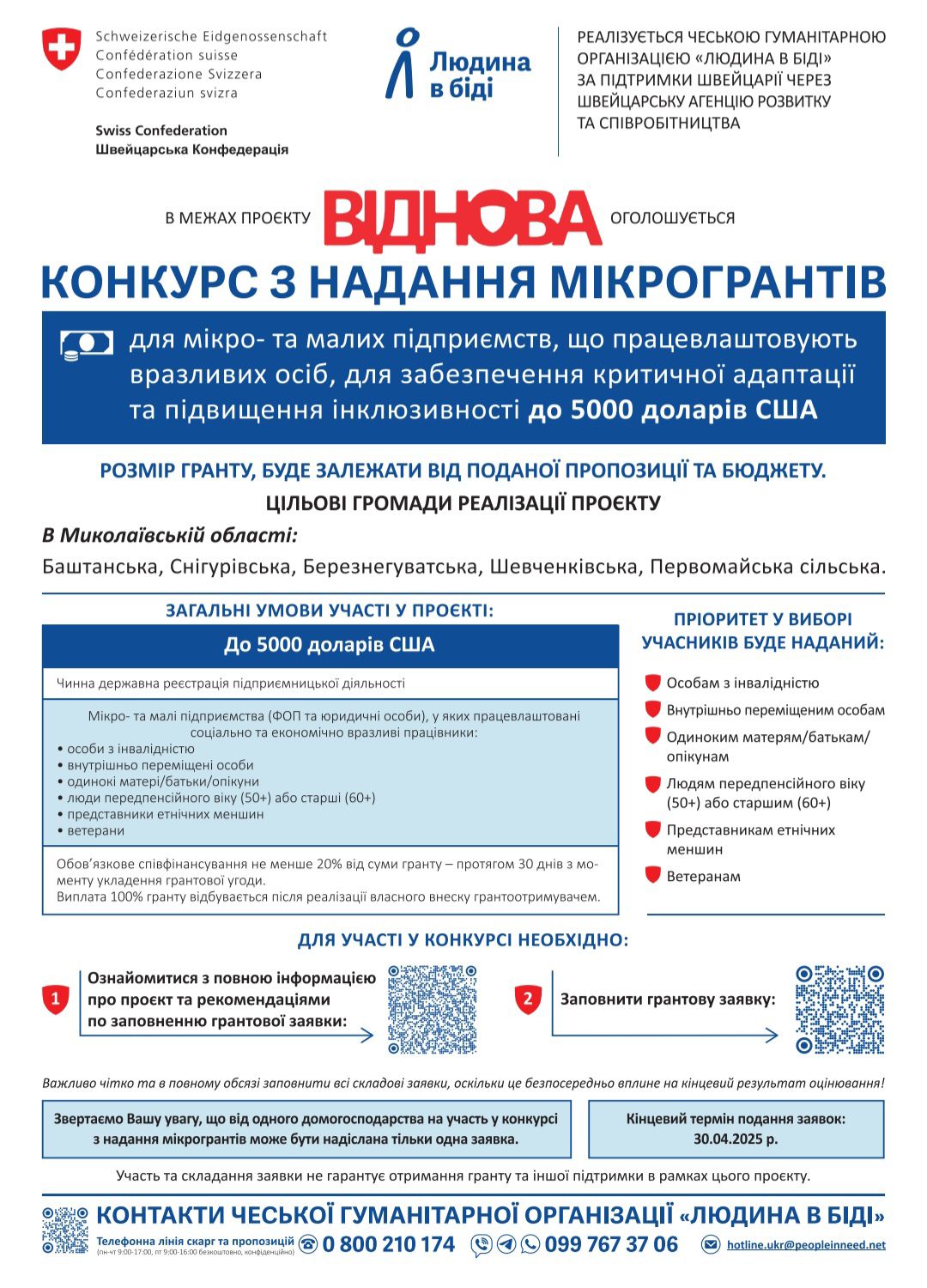 Чеська гуманітарна організація «Людина в біді» за фінансової підтримки Швейцарії через Швейцарську агенцію розвитку та співробітництва оголошує конкурс мікрогрантів: для мікро- та малих підприємств, що працевлаштовують вразливих осіб, для забезпечення критичної адаптації т підвищення інклюзивності: до 5000 доларів США