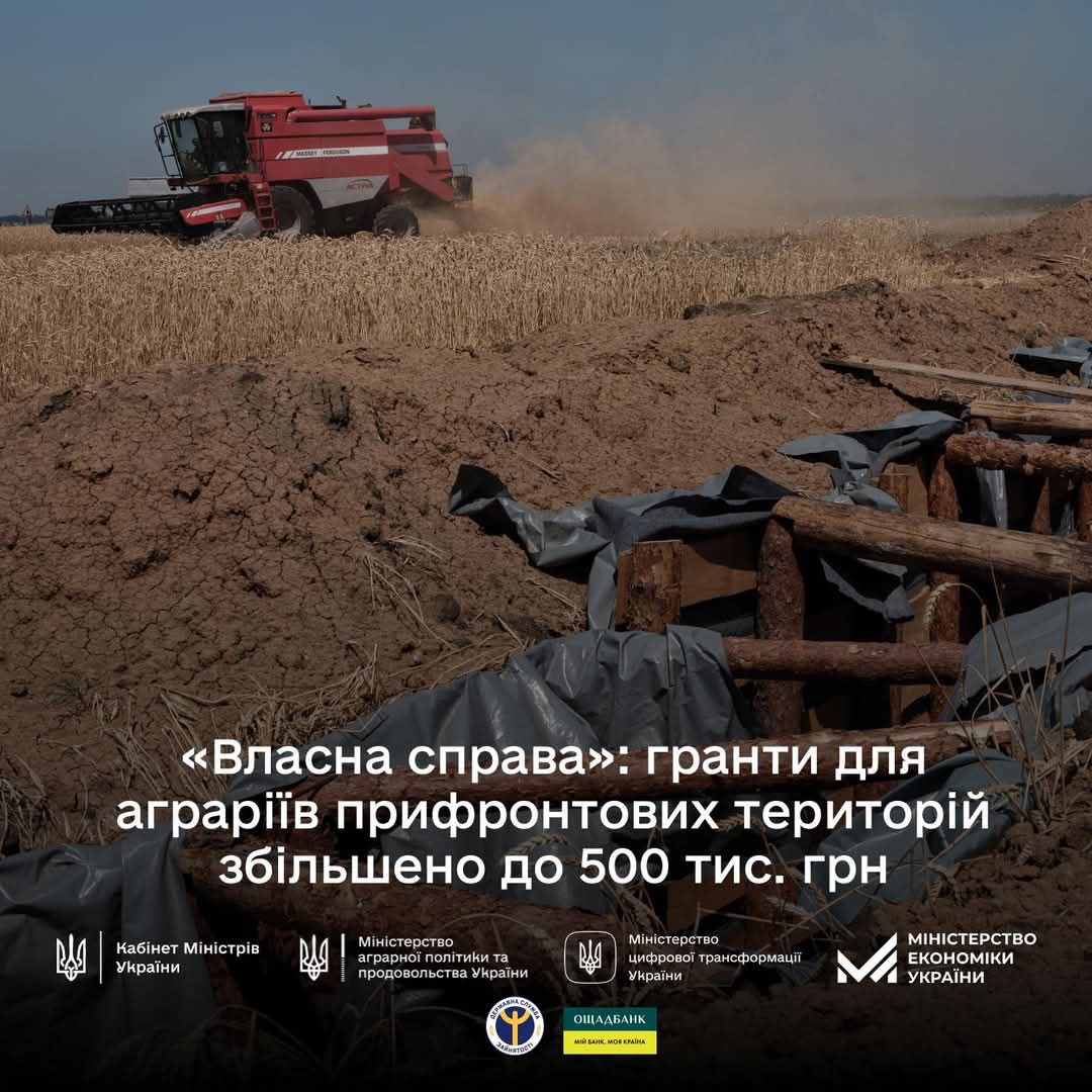 Кабінет Міністрів України ухвалив рішення про збільшення максимального розміру гранту за програмою «Власна Справа» до 500 тис. гривень для підприємців, які ведуть або планують розпочати діяльність у прифронтових областях. Раніше розмір грантів був збільшений для підприємців Харківської області.