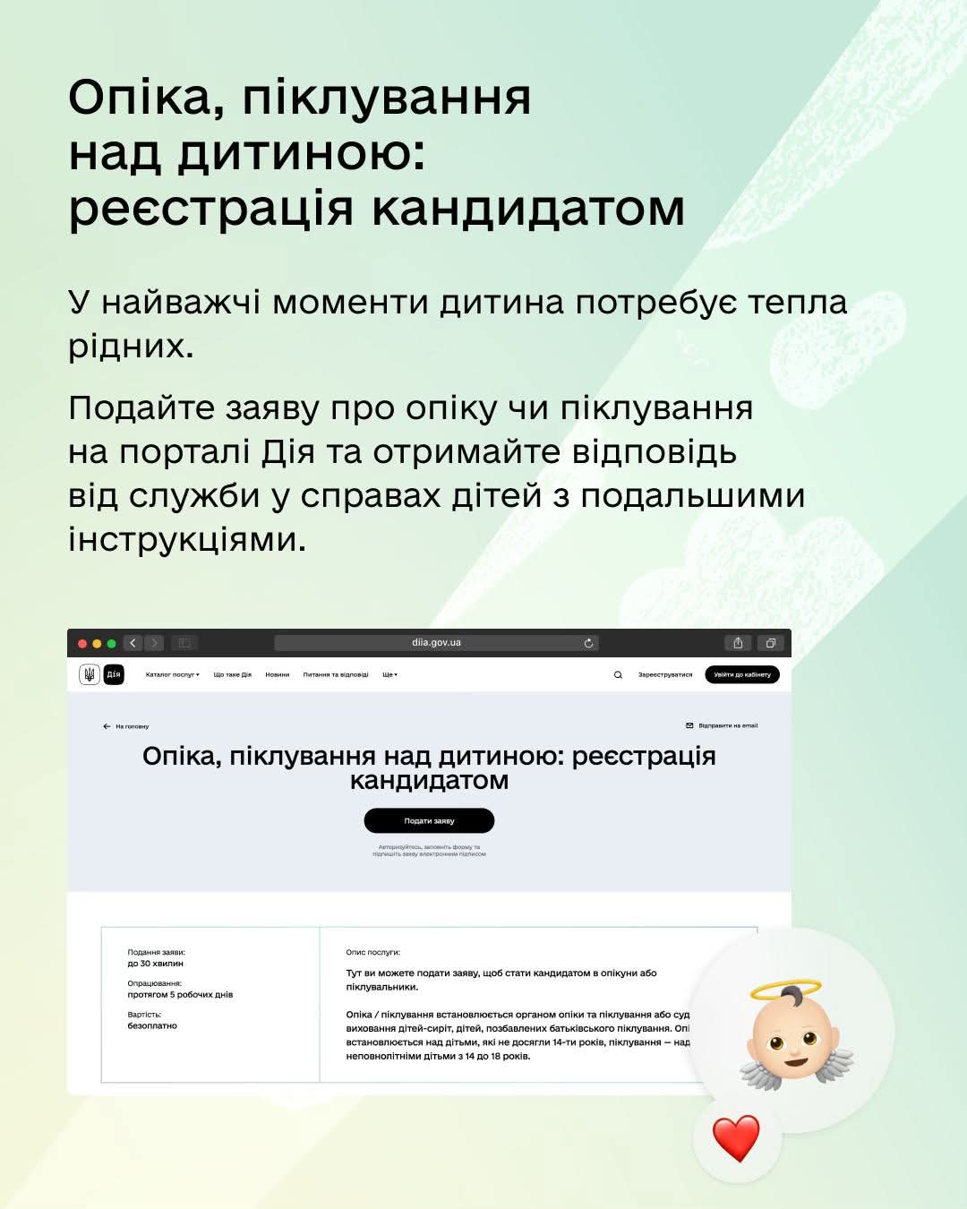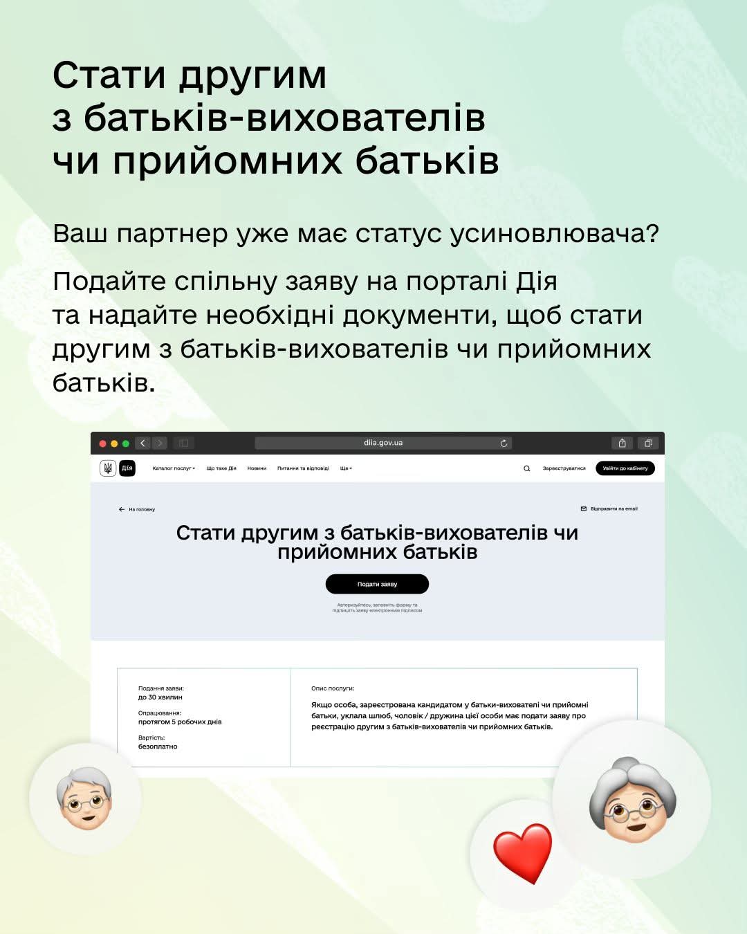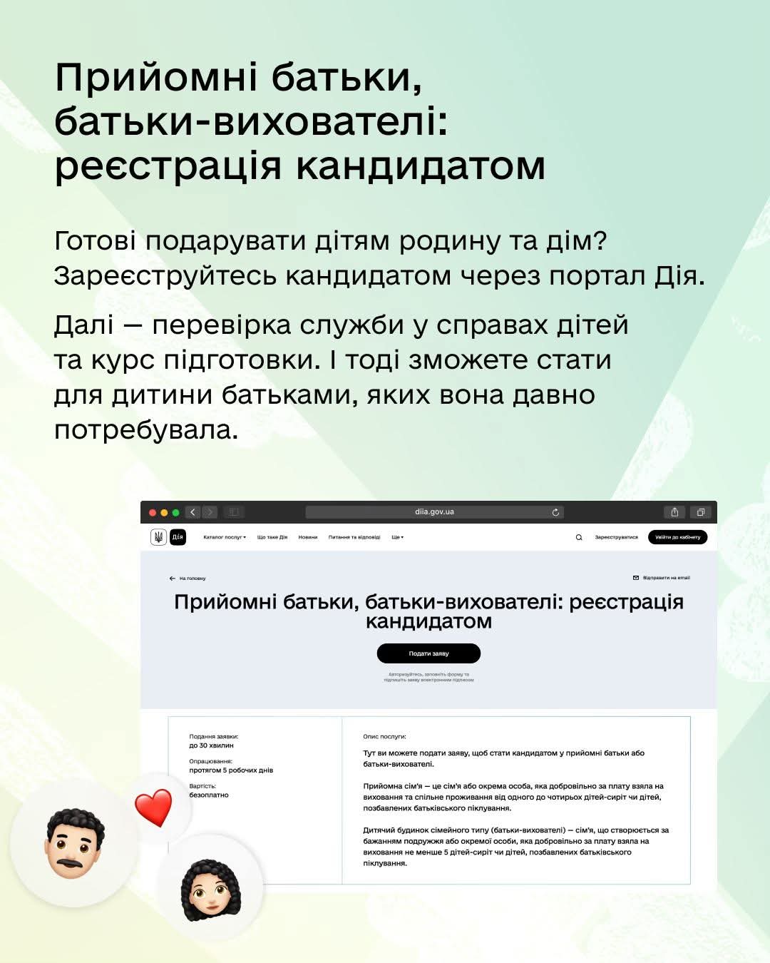 Більше про доступні послуги дізнавайтеся в Гіді з державних послуг. А детальніше про усиновлення та різні сімейні форми виховання — на державній платформі dity.gov.ua.